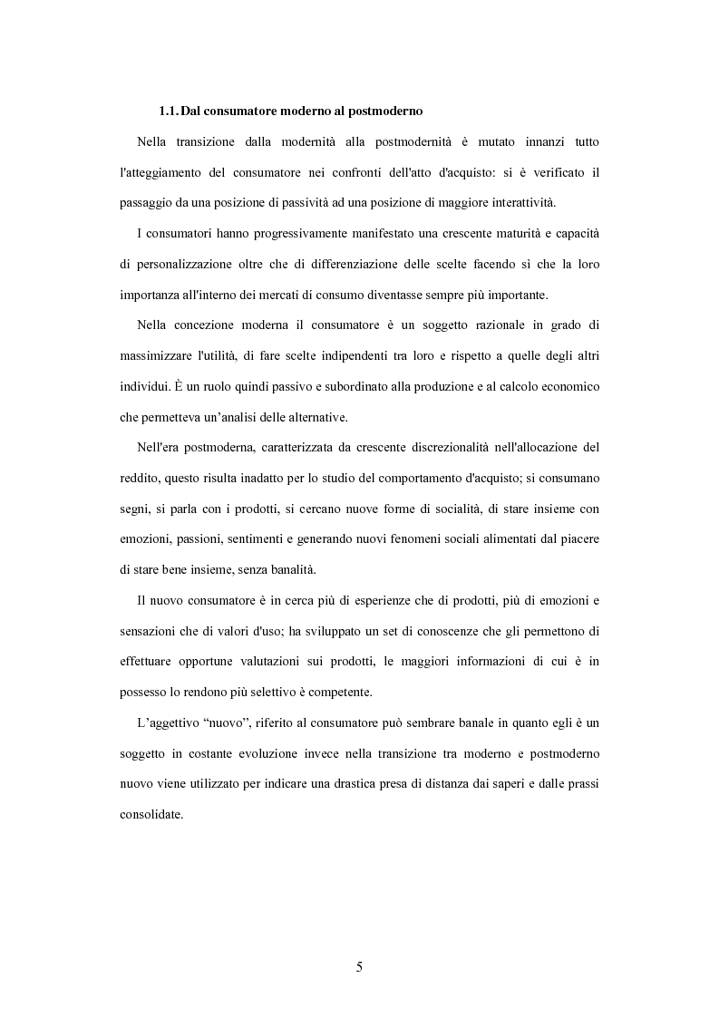 Dal consumatore moderno al postmoderno Nella transizione dalla modernità alla postmodernità è mutato innanzi tutto l'atteggiamento del . Nella transizione alla postmodernità protagonista è un nuovo consumatore che ha ben poco in comune con la tradizionale figura che conosciamo. Il passaggio dal consumatore moderno a quello postmoderno non si è ancora evoluto nella sua totalità, questo poiché abbiamo a che fare con .